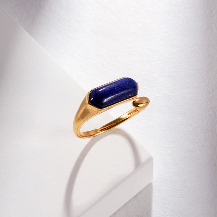This open ring showcases a elongated hexagonal natural lapis lazuli, exuding a deep celestial blue with golden flecks. The rich hues of the natural stone beautifully contrast with the warm glow of the 18K gold-plated sterling silver, creating an elegant and refined aesthetic.