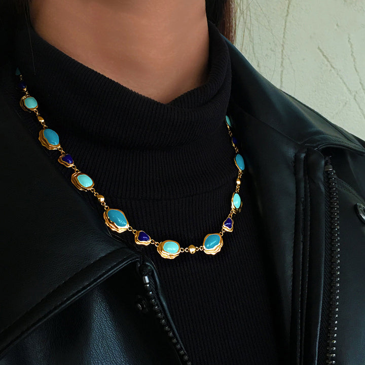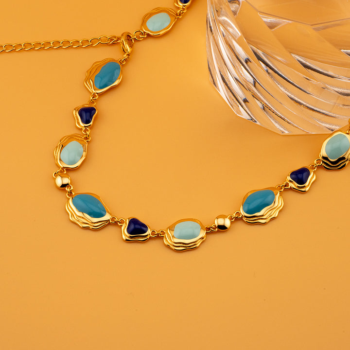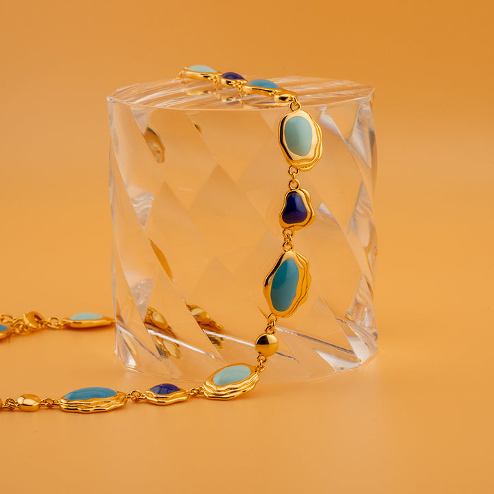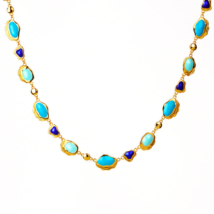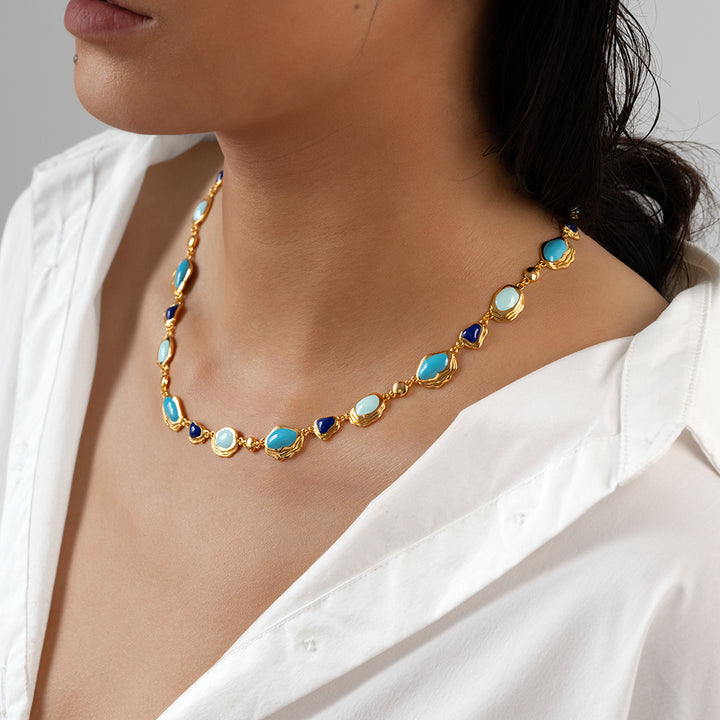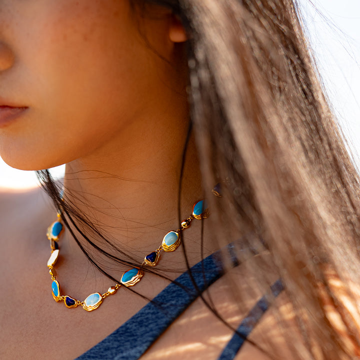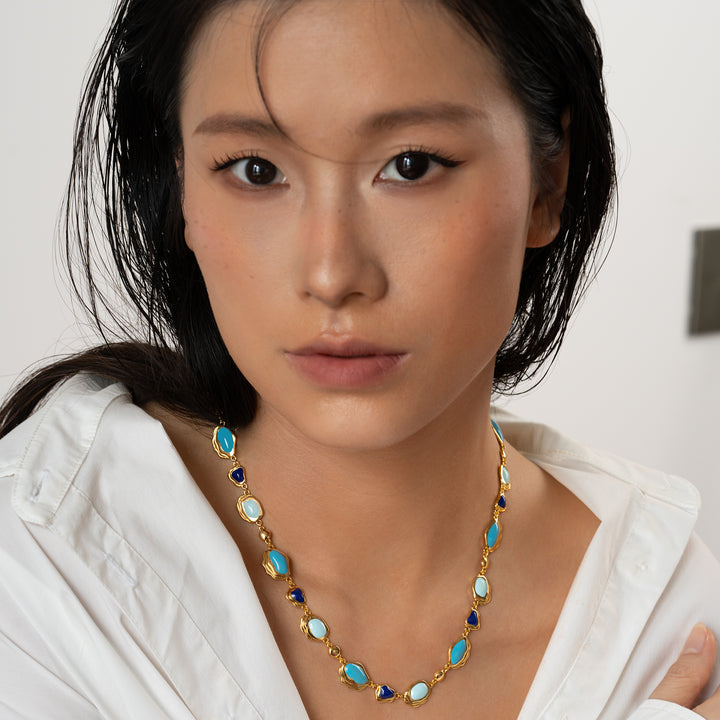 Introducing our Ocean Wave Enamel Drop Necklace – a vibrant and elegant piece that adds a touch of playfulness to your style. The necklace features enamel drops in three different shades of blue: Maldives Blue, Sky Blue, and Navy Blue. Its delicate design captures the rhythmic movement of ocean waves. Made from high-quality brass and plated with 22K gold, this necklace exudes luxury and sophistication. Perfect for both everyday wear and special occasions, this versatile and eye-catching necklace is a must-have addition to your jewelry collection.